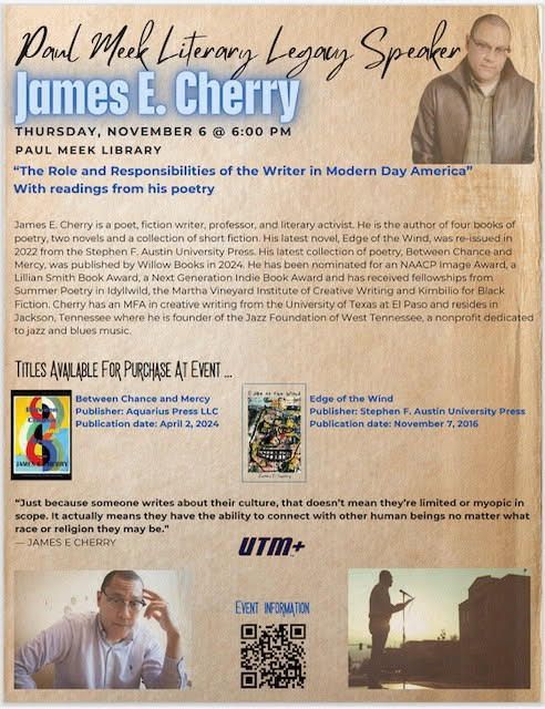 James E Cherry is a poet, fiction writer, professor, literary activist and impresario. He is the author of four books of poetry two novels and a collection of short fiction. His latest novel, Edge of the Wind, was re-issued in 2022 from Stephen F. Austin University Press. His latest collection of poetry, Between Chance and Mercy, is forthcoming from Willow Books. He has been nominated for an NAACP Image Award, a Lillian Smith Book Award and a Next Generation Indie Book Award. His writing have been published in journals and anthologies both in the U.S. and internationally. Cherry has an MFA in creative writing from the University of Texas at El Paso and resides in Tennessee with his wife, Tammy.